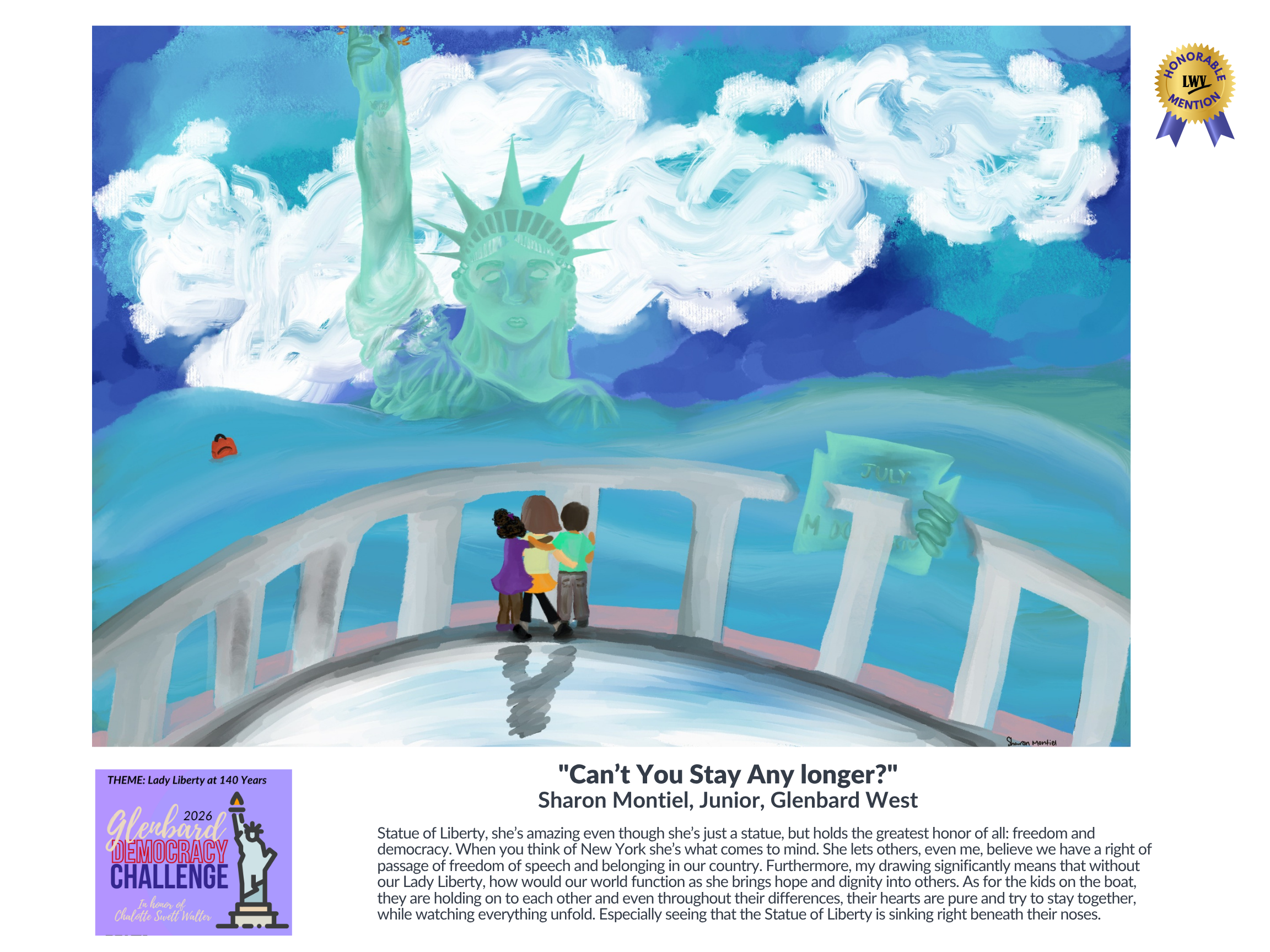 Entries will be judged by the Charlotte Swett Walter Committee of the League of Women Voters of Glen Ellyn based on creativity, originality and execution. The winning submissions will be the work that the judges believe best captures the theme: “Lady Liberty at 140: What does she mean to you and to democracy?