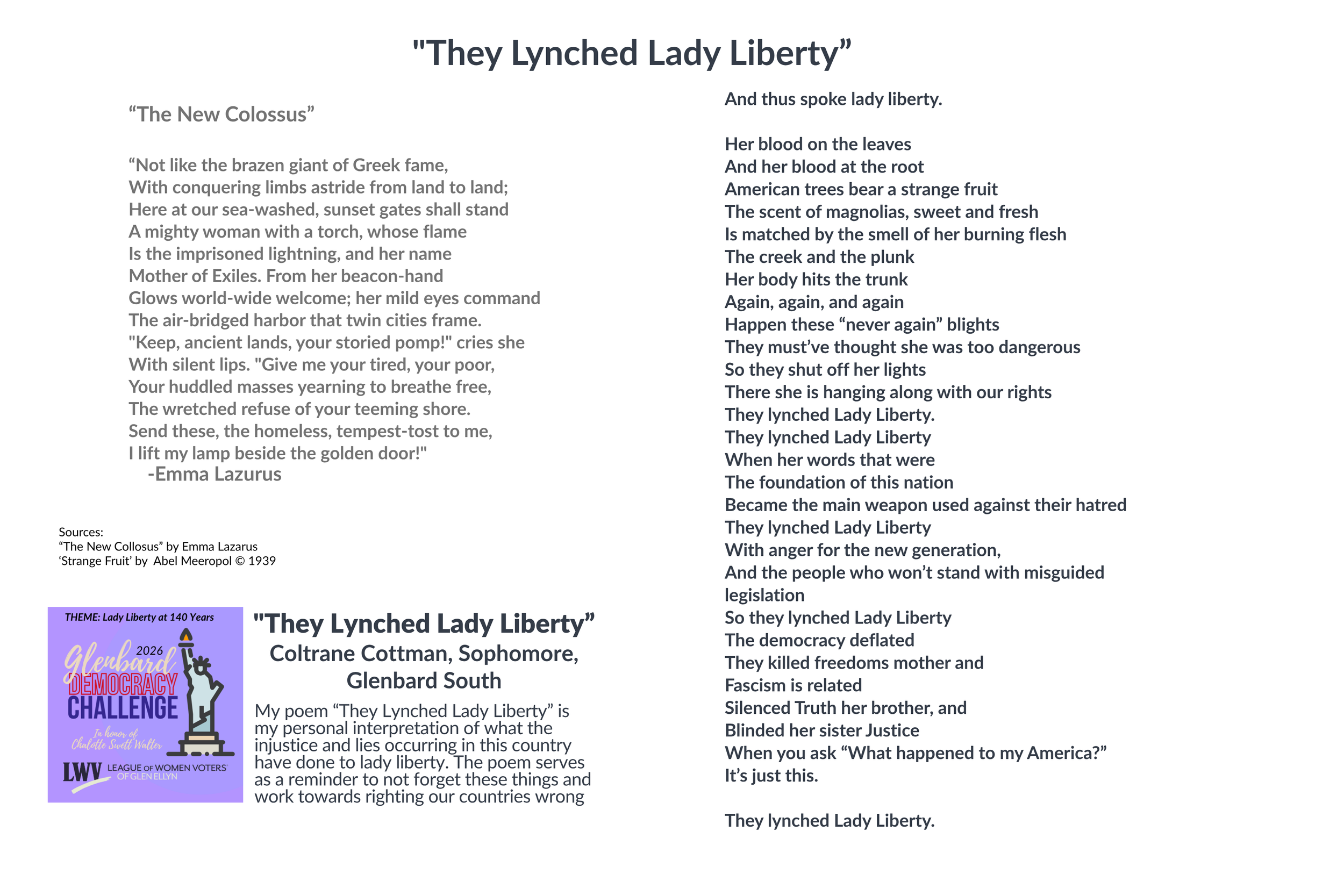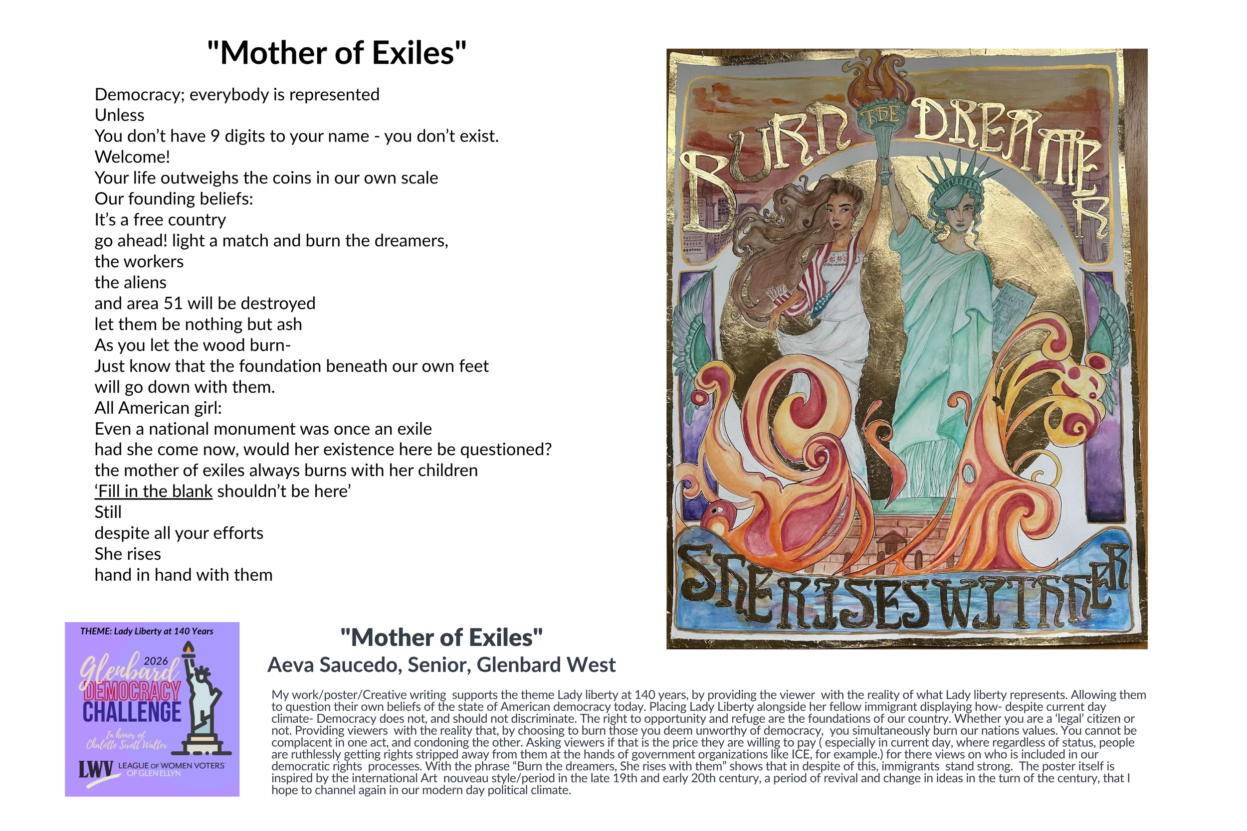 The Charlotte Swett Walter (CSW) Glenbard Democracy Challenge took place in the spring of 2025 at Glenbard West and South. A creative competition, the challenge asked students to portray the theme ”We the People?” through music, dance, creative writing, art, video, etc. A $500 cash prize was awarded to a student at both GBW and GBS and the winners presented their entry at the LWVGE Annual Meeting. Winners and their work are presented below. Congratulations to the 2025 winners: Amelia Buhle, Senior Glenbard South and Lily Wiedholz, Senior at Glenbard West for their award winning entries, shown below. Runners up were Iman Meah from GBS and Mary McCluskey from GBW.