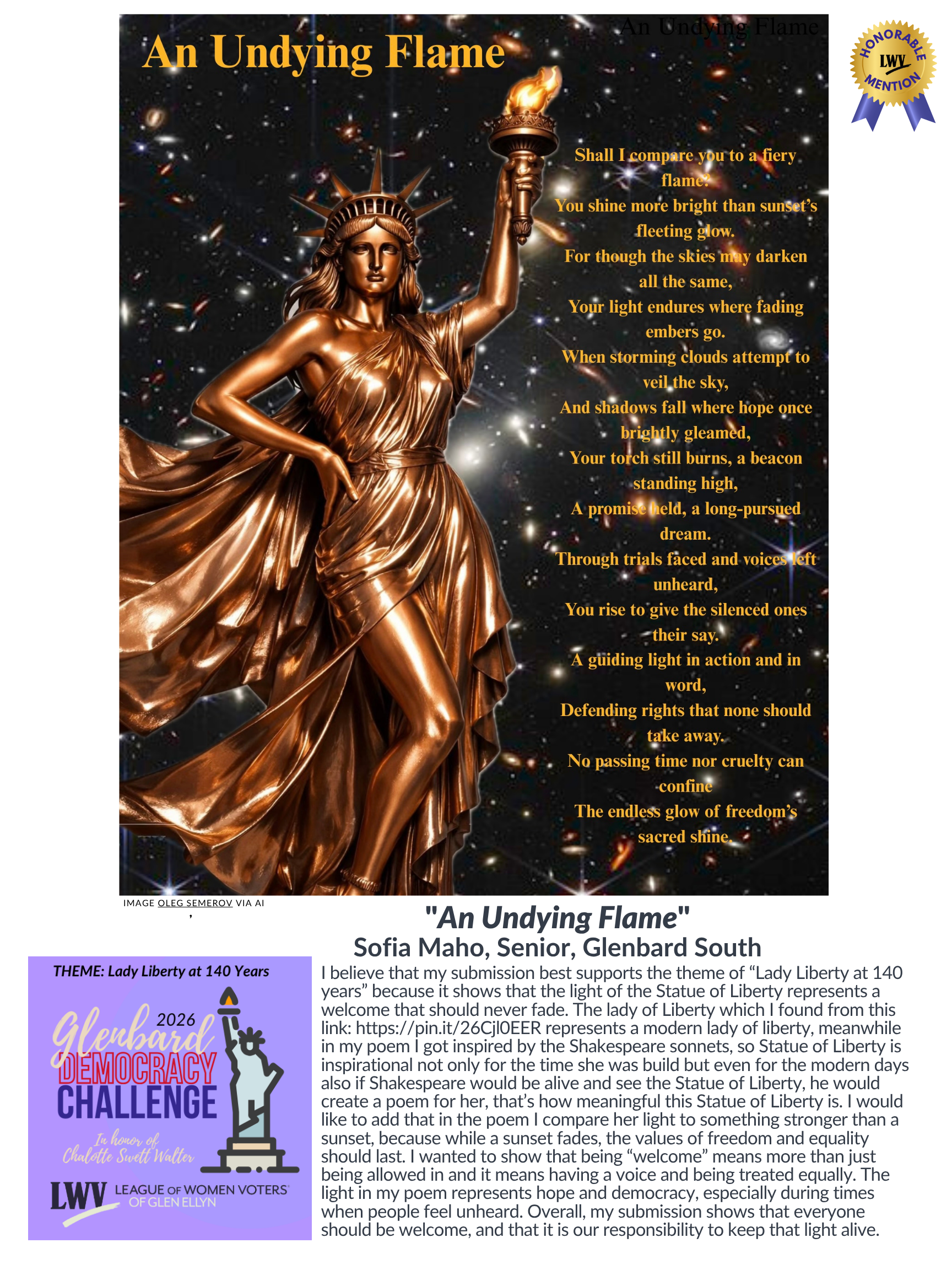 The Charlotte Swett Walter (CSW) Glenbard Democracy Challenge took place in the spring of 2026 at Glenbard West and South. A creative competition, the challenge asked students to portray the theme: Lady Liberty at 140 Years through music, dance, creative writing, art, video, etc. A $500 cash prize was awarded to a student at both GBW and GBS and the winners presented their entry at the LWVGE Annual Meeting in April. The challenge is named for long-time League member Charlotte Swett Walter whose estate bequeathed funds for use in our educational endeavors. See profile at the bottom of the page for more information on Charlotte and her contributions to defending democracy in Glen Ellyn.